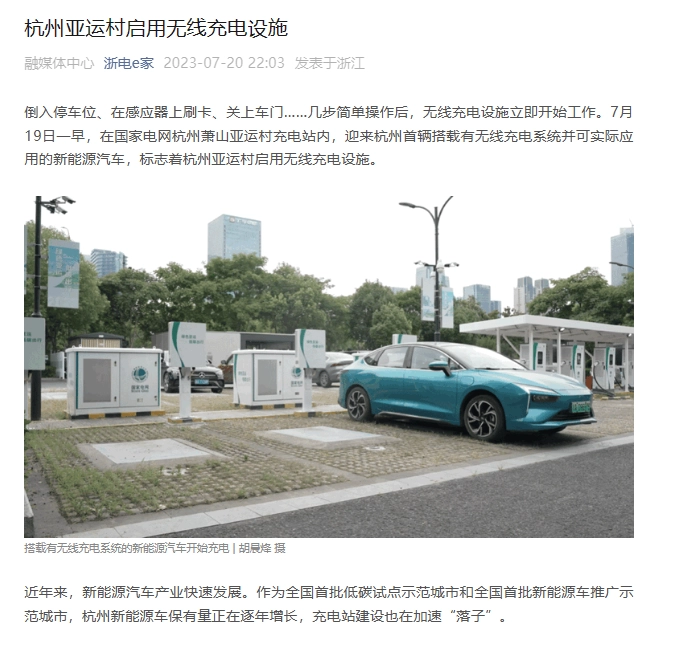 国网杭州市萧山区供电公司工作人员李豪帅指出,“亚运村充电站的无线充电设施、原理,与我们日常生活中的手机、耳机实现无线充电类似,通过充电设施和汽车内的线圈,分别发射和接收电能。此外,汽车无线充电避免了接触式充电需考虑统一接口的麻烦、裸露导体存在的安全风险”。
