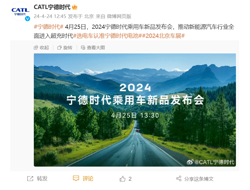 据 ITBEAR科技资讯 消息,动力电池行业的领军企业宁德时代官方宣布,25日举行2024宁德时代乘用车新品发布会。此次发布会的口号为“推动新能源汽车行业全面进入超充时代”,预示着宁德时代可能将推出具有革新性的超快充电技术。