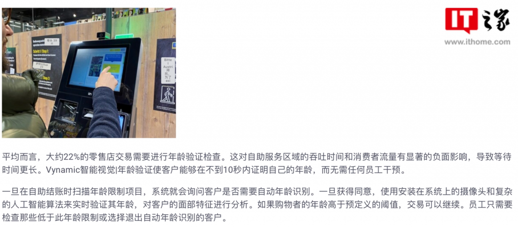 而在引入相关 AI 摄像头后,一旦在顾客自助结账时扫描“年龄限制”商品,系统就会询问客户是否需要进行年龄识别。一旦获得同意,结账机就会设备内置的摄像头配合算法来实时验证年龄。如果购物者的年龄高于预定义的阈值,交易可以继续。如果用户面容“过于年轻”,那么还是需要将身份证件提交给员工验证。