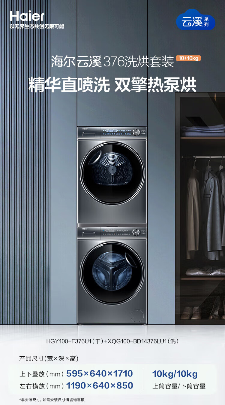 海尔 云溪系列 376 直驱智投洗衣机 + 376 热泵烘干机 组合套装 日常售价 12999 元,近日京东自营“三联电器京东自营专区”618 预售价 9999 元。