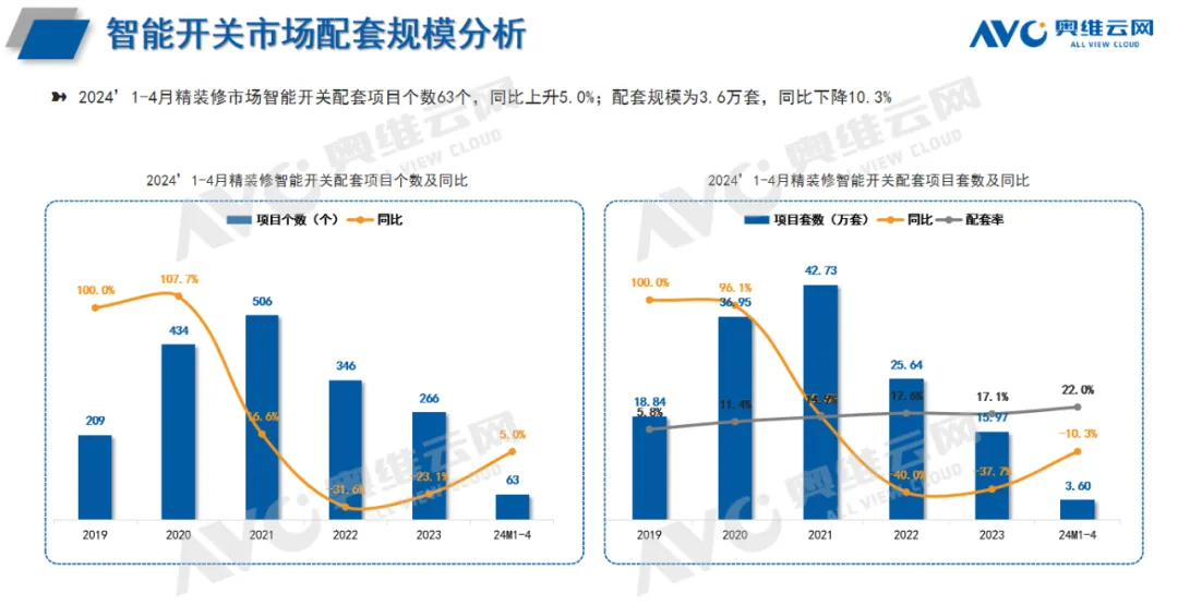 奥维云网(AVC)地产大数据显示,2024年1-4月精装修市场新开盘楼盘项目个数276个,同比-17.9%;精装套数16.38万套,同比-23.7%。精装项目渗透率32.4%。其中智能家居(智能门锁、智能开关、智能家居系统)精装修市场规模22万套,同比-18.1%。