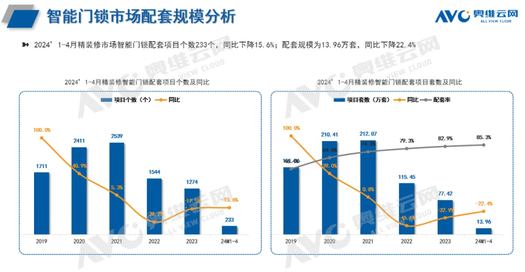 2024年1-4月精装修市场智能家居系统配套项目个数86个,同比+16.2%;配套规模为4.43万套,同比-8.3%;配置率为27.1%,同比+4.6%。智能开关配套项目个数63个,同比+5%;配套规模为3.60万套,同比-10.3%,配置率为22%,同比+3.3%。可以看出虽然整体精装修大盘在下降,但是智能家居系统和智能开关的项目数量和配置率均在增长。智能门锁配套项目个数233个,同比+1.5%;配套规模为13.96万套,同比-22.4%;配置率为85.3%,同比+1.5%。