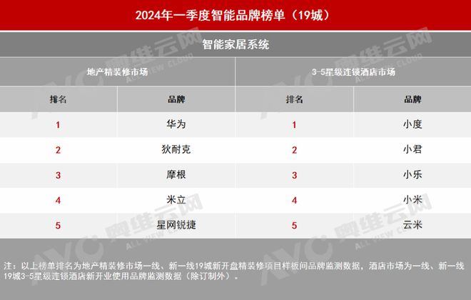 根据奥维云网(AVC)监测数据,2024年一季度一线、新一线19城地产精装修新开盘项目和酒店3-5星级连锁酒店新开业规模为11.1万套(间),其中智能家居系统规模累计为3.3万件。监测数据显示,奥维云网(AVC)2024年一季度19城“工程市场智能家居系统品牌排行榜”如下: