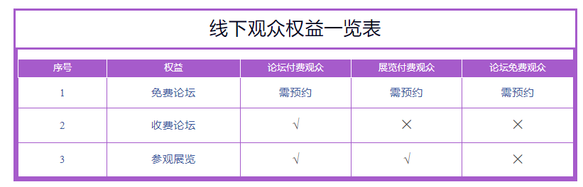 公众可通过云平台进行注册报名,登记完整信息后,免费或付费参与线下大会。线下观众具体分为论坛免费观众、论坛付费观众、展览付费观众三大类,不同观众身份及权益如下: