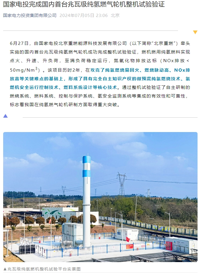 国家电力投资集团有限公司宣布,国内首台兆瓦级纯氢燃气轮机已于 6 月 27 日成功完成整机试验验证,燃机燃用纯氢燃料实现点火、升速、升负荷,至满负荷稳定运行,氮氧化物排放达标(NOx 排放<50mg / Nm3),标志着我国在纯氢燃气轮机研制方面取得重大突破。