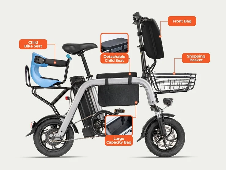 此款 Mihogo 迷你电动自行车采用可折叠设计,重量约为 19Kg,可选中置挎包、前筐以及后置儿童座椅等配件。