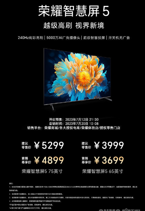 据悉,荣耀智慧屏5支持240Hz绚彩高刷技术,能够带来震撼沉浸的观影和游戏体验。同时,它搭载了5000万像素AI广角摄像头,支持超清视频通话以及体感健身和游戏功能。产品运行MagicOS系统,支持超级智慧投屏,轻松连接手机、平板和笔记本设备。消费者可以选择65英寸或75英寸两个版本,首销尊享价从3699元起。