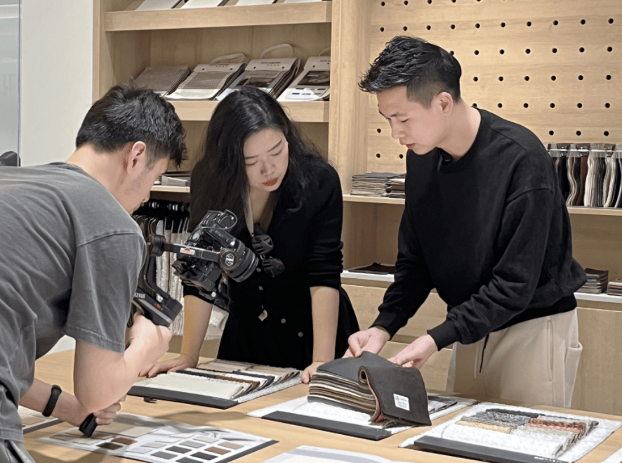 (主理人Sam在公司布样间与家居买手@一颗KK挑选MOYU莫语高定面料)
