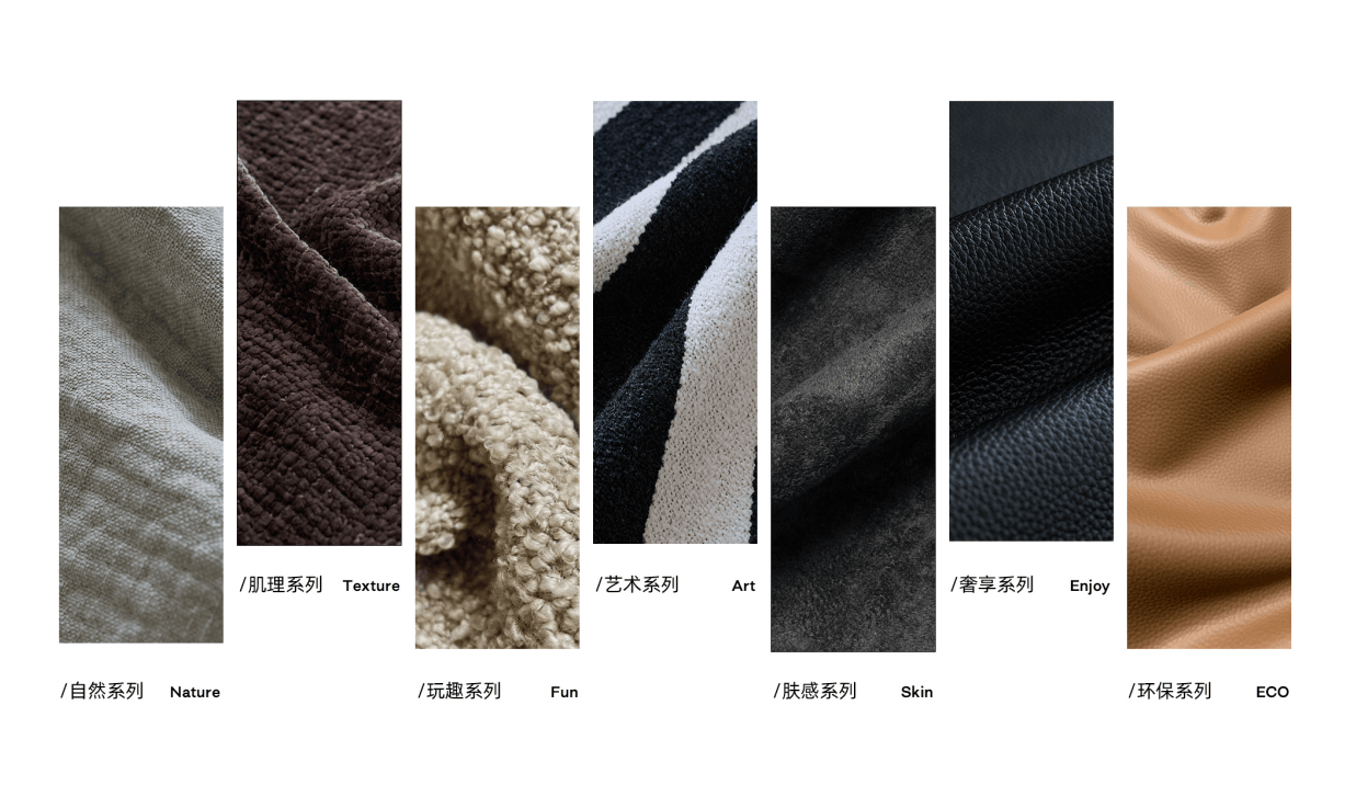 MOYU莫语也建立了也自己专有的面料体系,根据面料的材质特性、风格定位、客群定位等因素,将现有面料划分为七大系列,以满足用户多样化和个性化需求。
