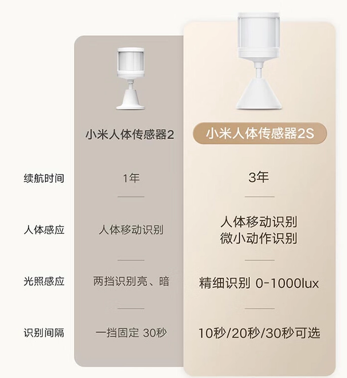 与上代相比,小米人体传感器 2S 续航时间由 1 年升级为 3 年,在人体移动识别的基础上升级了微小动作识别,光照感应由两档升级为可精细识别 0-1000lux,识别间隔由一档固定 30 秒,升级为 10 秒 / 20 秒 / 30 秒可选。