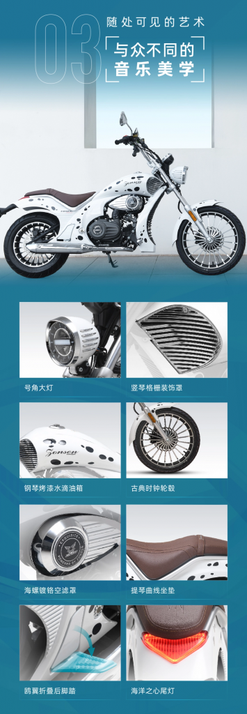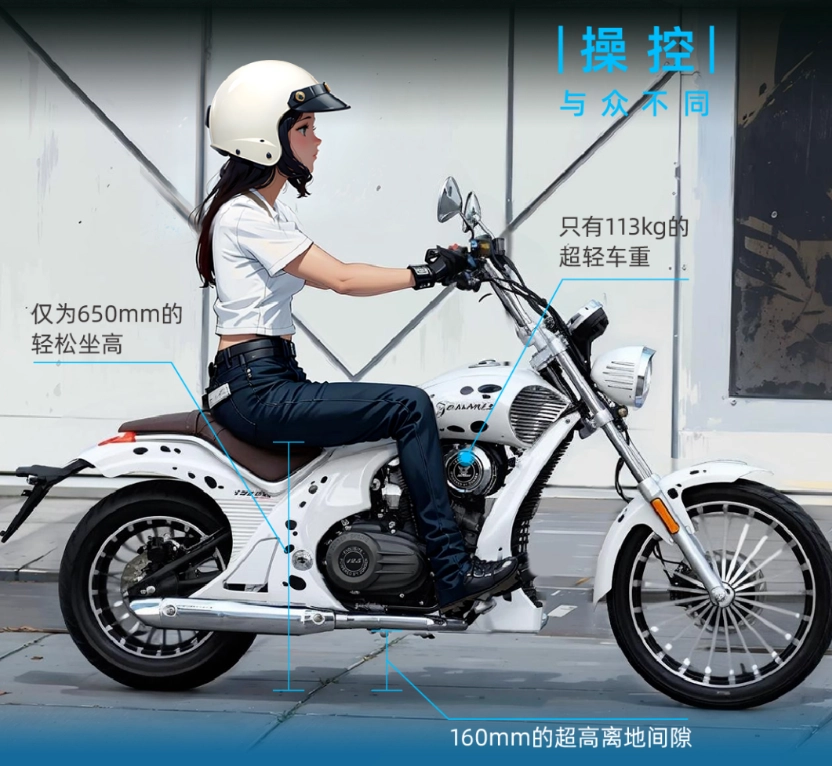 YOMI 的油箱容积 6.5L,配有液晶仪表盘、前后减震、前后碟刹,最高车速可达 85km/h。