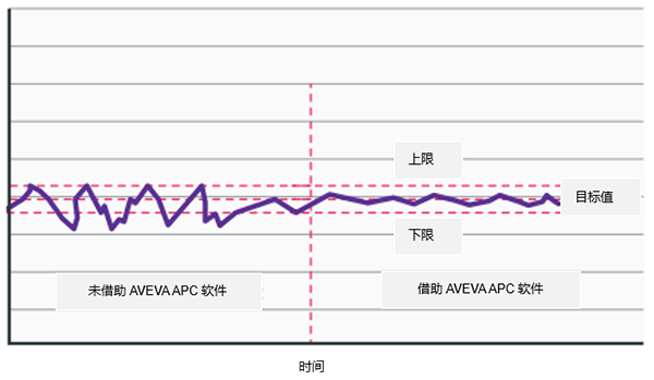 如下图举例:该流程是一家水泥厂炉内温度的时间变化曲线,在未引入AVEVA APC先进过程控制软件时,炉内温度会围绕设定值大幅度波动,每当出现一次波动峰值,都会产生不必要的能耗。而通过AVEVA APC进行精确控制后,波动明显放缓,降低能耗同时减少了由于温度过高造成的故障风险。