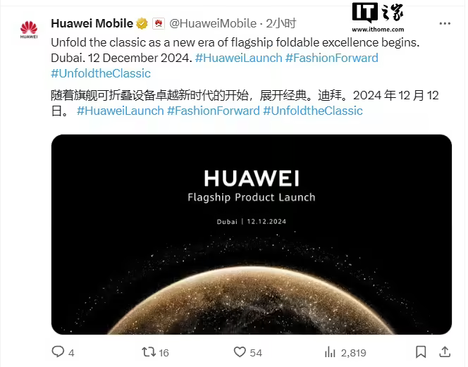 华为今天在其全球 X 平台的官方账号上分享了一张海报,该海报与 11 月 26 日在中国举办的“华为 Mate 品牌盛典”的巨型海报相同。华为还写道:“开启经典新纪元,旗舰折叠手机卓越新征程由此展开。迪拜。2024 年 12 月 12 日。#华为新品发布 #时尚前沿 #开启经典”