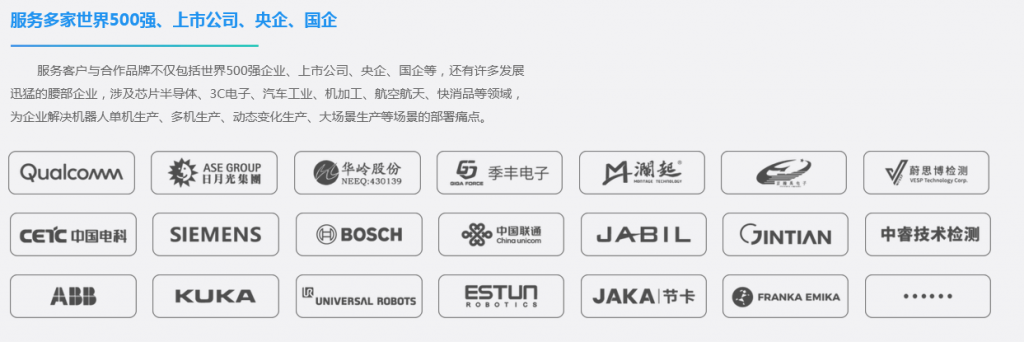 服务客户与合作品牌不仅包括世界500强企业、上市公司、央企、国企等,还有许多发展迅猛的腰部企业,涉及芯片半导体、3C电子、汽车工业、机加工、航空航天、快消品等领域,为企业解决机器人单机生产、多机生产、动态变化生产、大场景生产等场景的部署痛点。