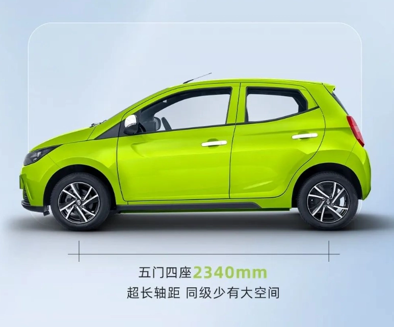 此款车型有未来青、极光白、动感绿三种车身颜色,尺寸为 3500*1646*1460mm,轴距为 2340mm,定位纯电动微型车。