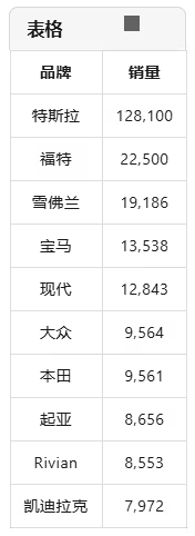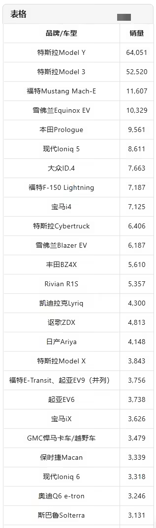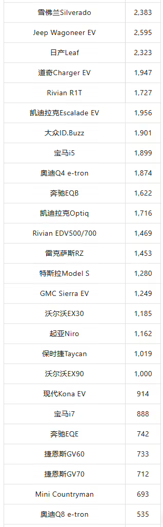 2025 年第一季度美国电动汽车品牌销量前 10 名如下: