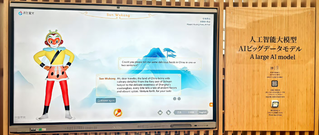 中国第一部彩色动画长片《大闹天宫》中的”孙悟空”形象,是国人心中当之无愧的动画英雄。这一次,在讯飞星火大模型的科技赋能下,“AI孙悟空”用中日英三国语言实时与观众进行对话交流、传播中国文化,化身世博会中国馆的“导览小能手”,图文并茂地介绍中国地道美食以及意境深远的古诗词。