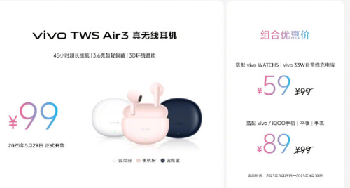 vivo TWS Air3 耳机售价为 99 元