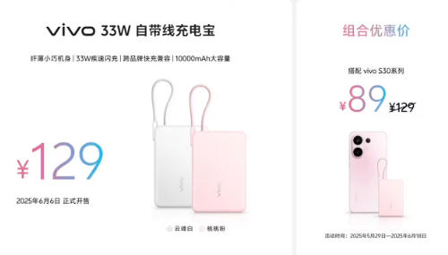vivo 33W 自带线充电宝售价129元,该产品将于 6 月 6 日正式开售。
