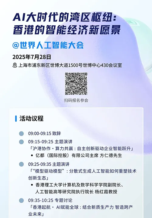 其中,“AI大时代的湾区枢纽:香港的智能经济新愿景”论坛将于7月28日上午在上海世博中心举行,邀请香港与内地人工智能领域知名专家、学者、企业家共同探讨人工智能如何重塑科技创新生态、香港在全球创科合作中的角色等议题。