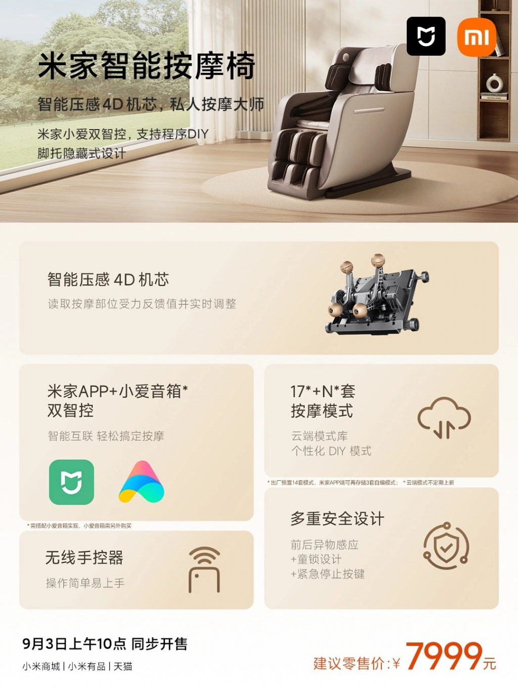 小米米家款智能按摩椅已正式开启零售,定价 7999 元,将于 9 月 6 日 20 点开售。
