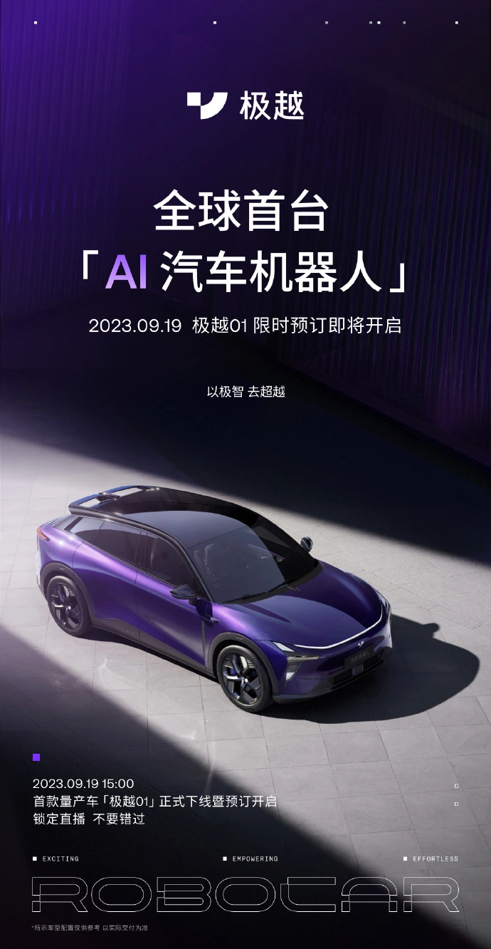 极越汽车官微宣布,被定义为“全球首台 AI 汽车机器人”的极越 01 将于 9 月 19 日 15:00 正式首发亮相,同时开启限时预订。