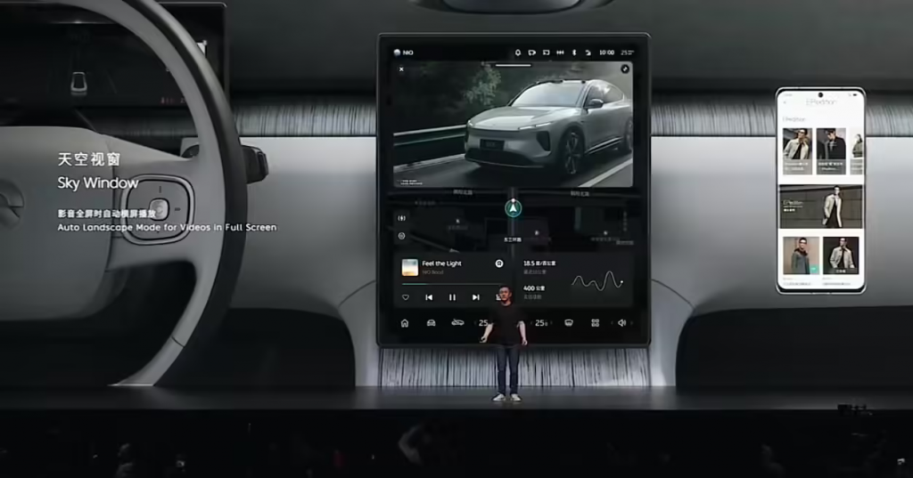 蔚来 NIOPhone 支持“天空视窗”,可以在车机上操控手机应用(非直接投屏,可独立操作)、NIO Link 车机大屏玩手机游戏。