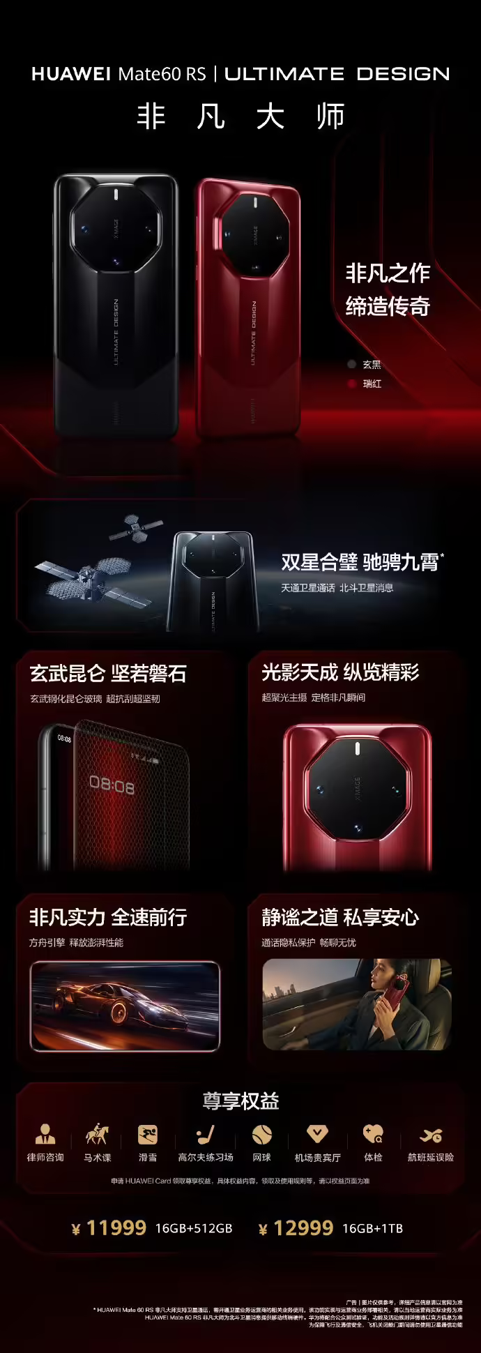 华为 Mate 60 RS 非凡大师版手机的详细配置和售价现已公布。该机提供玄黑、瑞红两种配色,采用陶瓷机身,购机还可享受一系列“尊享权益”(需申请 HUAWEI Card 领取)。