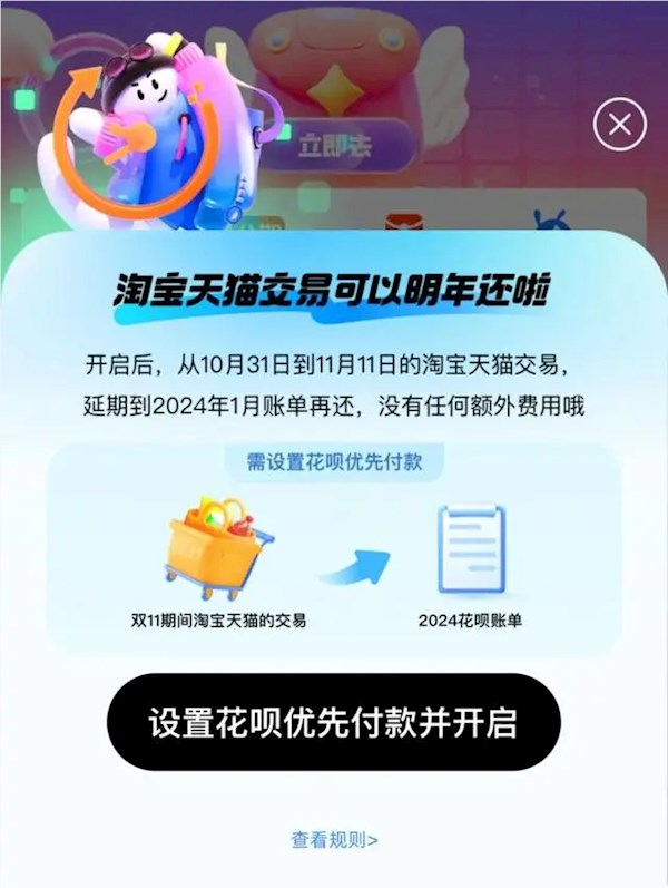 开启后,从10月31日到11月11日的淘宝天猫交易,可延期至2024年1月账单再还,没有任何额外费用。