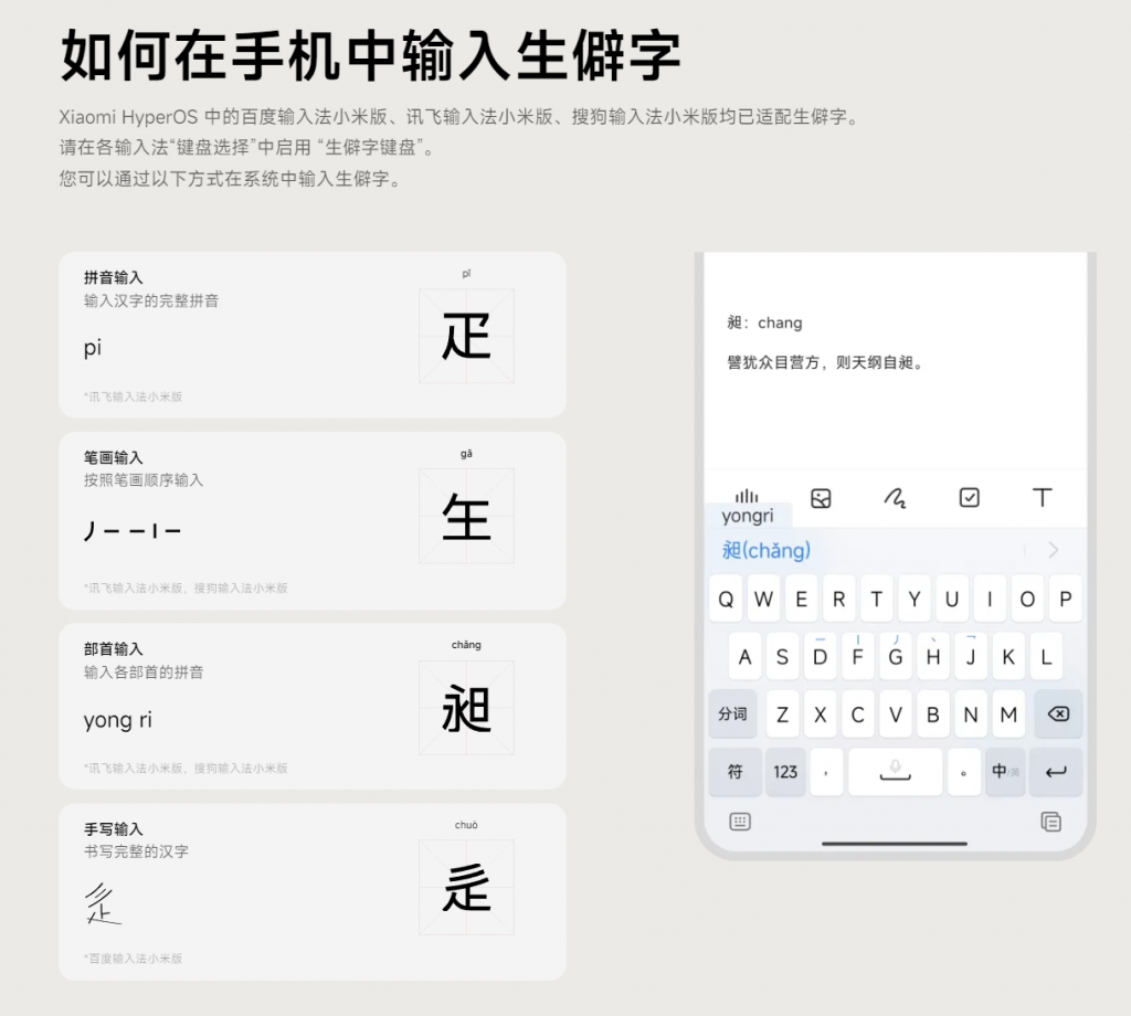 据介绍,小米刚刚发布的 HyperOS 中已经内置了适配生僻字的百度输入法小米版、讯飞输入法小米版、搜狗输入法小米版,其他用户可以自行下载字体文件。