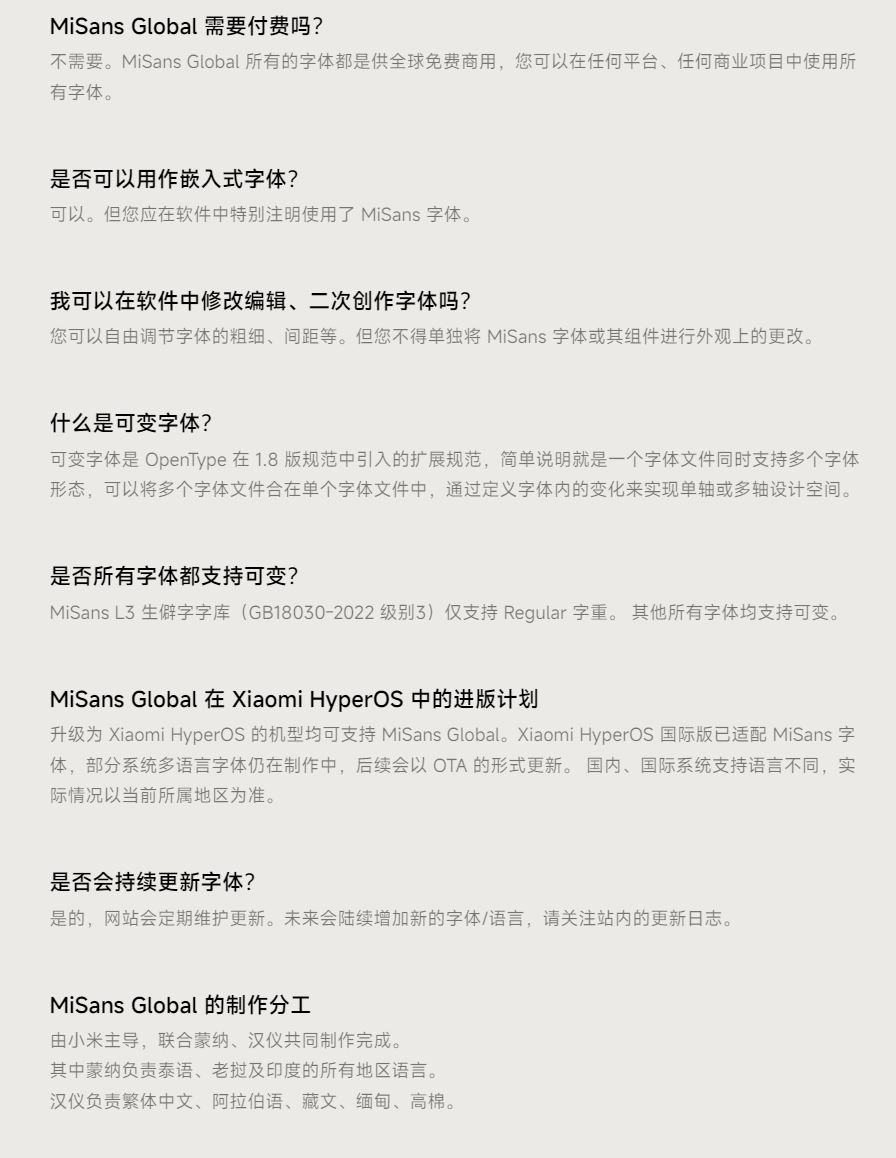 随着小米 HyperOS 澎湃系统的发布 ,小米设计团队也对原先提供的免费商用字体进行了更新。本次更新带来了大量生僻字支持,而且符合最新 L3 级别 GB18030-2022 国标。