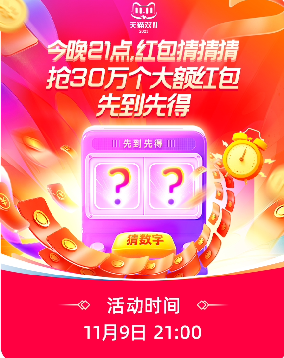 20点-20点半,天猫可抽一次加码红包,人人可领,中奖率95%。1.1元起无门槛红包 10万个11.1元红包,限时不限量。