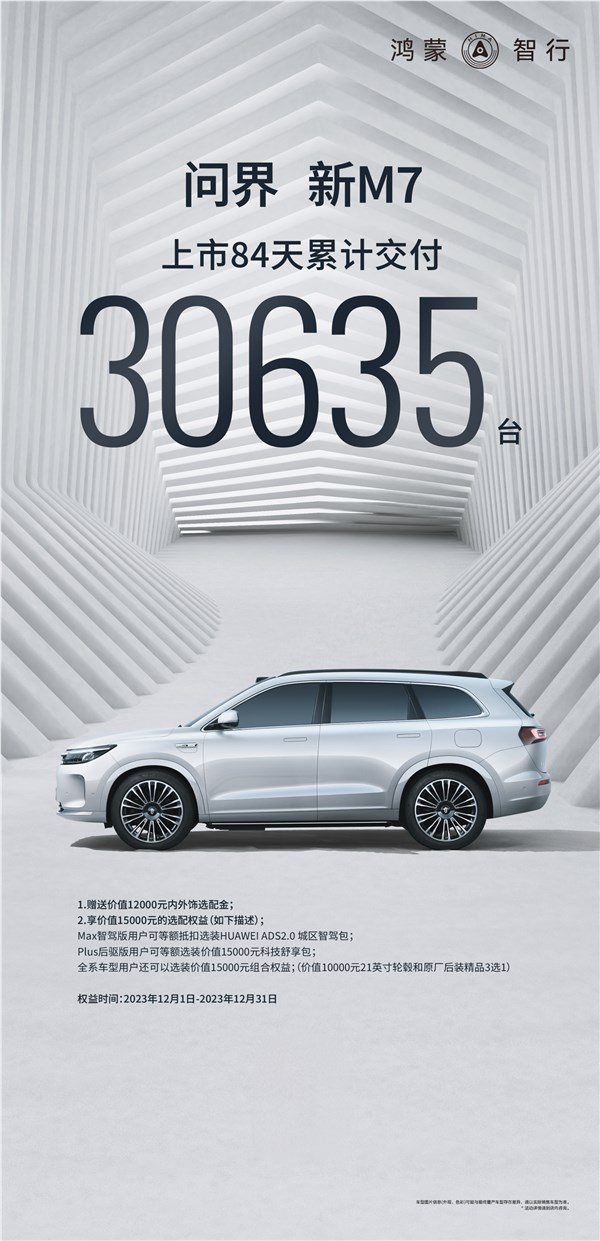 官方数据显示,问界新M7上市84天交付量已达到30635台,其中在10月份交付10547台,11月交付15242台。