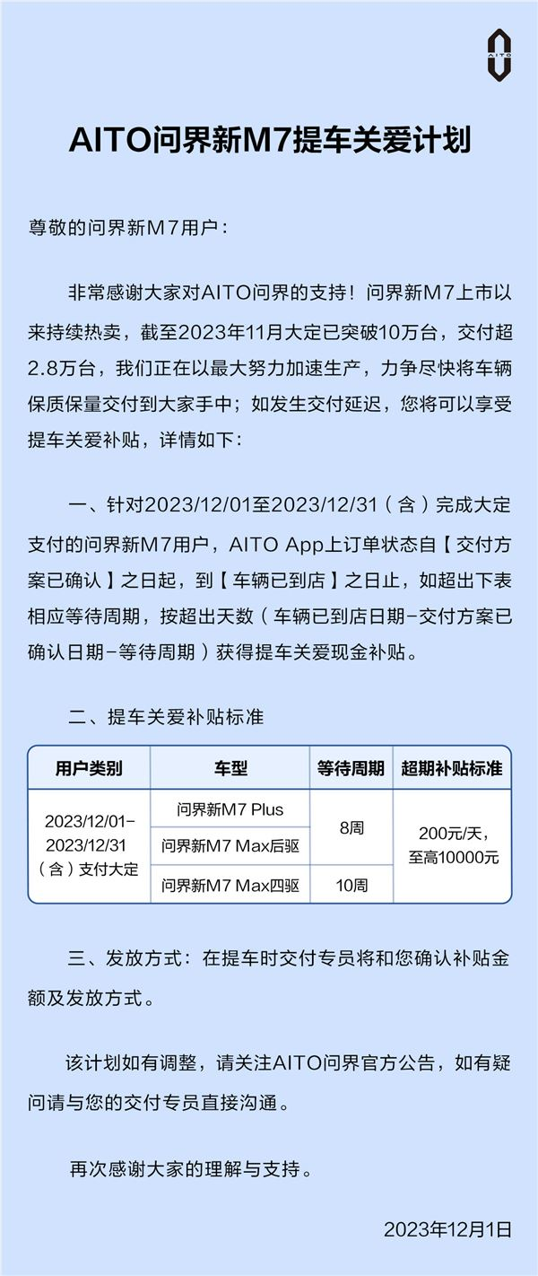 值得一提的是,AITO问界新M7提车关爱计划”已延续到12月底,若发生交付延迟,用户可享受提车关爱补贴”,每天补贴200,上限为1万元,很多大定车主表示,车还没交,就已经开始挣钱了。