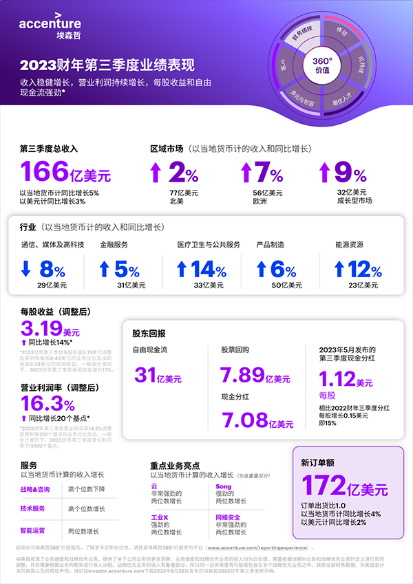 埃森哲最新财务报告显示,公司2023财年第三季度(截至2023年5月31日)全球营业收入达到166亿美元,以美元和当地货币计,分别同比增长3%和5%。2023财年第三季度经调整后的营业利润达27.1亿美元:调整后的营业利润率16.3%;稀释每股收益为3.15美元;新订单额为172亿美元。