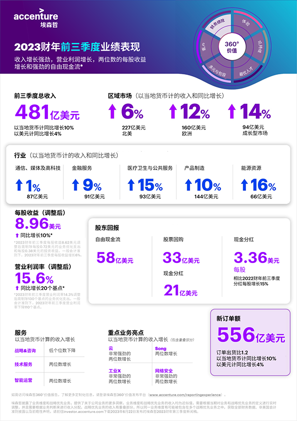 埃森哲董事长兼首席执行官沈居丽(Julie Sweet)表示:“公司三季度实现了坚实的新订单和营业收入,经调整的营业利润、每股收益和自由现金流十分强劲,表明我们的业务稳健有序。我们致力于成为客户转型的最佳伙伴,该战略继续获得市场认可,三季度全球有26个客户的订单额达到了1亿美元及以上。
