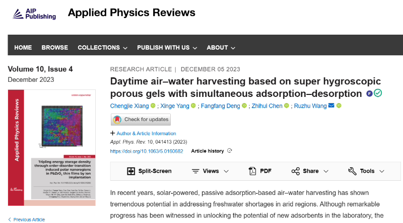 近日,该校王如竹教授领衔的“能源-水-空气”交叉学科创新团队 ITEWA 在物理领域国际期刊 Applied Physics Reviews 上发表了题为“Daytime air–water harvesting based on super hygroscopic porous gels with simultaneous adsorption–desorption”的研究论文。团队通过非离子型表面活性剂羟丙甲基纤维素与氯化锂经物理发泡形成多孔吸湿凝胶,提出了空气取水领域的“8020 原则”,在“解吸腔”和“冷凝腔”并联式装配的原理样机上验证了实际取水性能,为日间低成本连续式空气取水提供了一种新的可行路径。制冷与低温工程研究所博士后香承杰和博士研究生杨辛格为论文第一作者,王如竹教授为通讯作者。