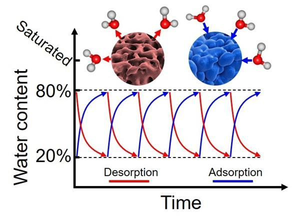 为此,研究团队在材料层面通过非离子型表面活性剂羟丙甲基纤维素与吸湿性盐氯化锂经物理发泡形成多孔吸湿凝胶,一方面解决了盐的泄露问题,另一方面提高了吸湿凝胶的吸附动力学性能。研究团队在装置层面开发了解吸腔和冷凝腔分离的并联式结构,极大提高了冷凝水回收效率,实现了日间同时吸附解吸的连续式空气取水。研究团队在系统运行层面,提出了太阳能驱动的被动式空气取水运行的“8020”原则,实现了太阳能和吸附材料的利用效率的最大化,实验证明在日间宽湿度工况下太阳能驱动的连续高效空气取水,材料吸附量高达 6.4 kgwater・kgsorbent-1,装置单日取水量高达 3.82 Lwaterkgsorbent-1day-1 和 1.93 Lwaterm-2day-1。该工作阐明了材料结构设计、装置和系统运行策略对空气取水的重要意义,为实现规模化高效吸附式空气取水提供了可行的新思路。