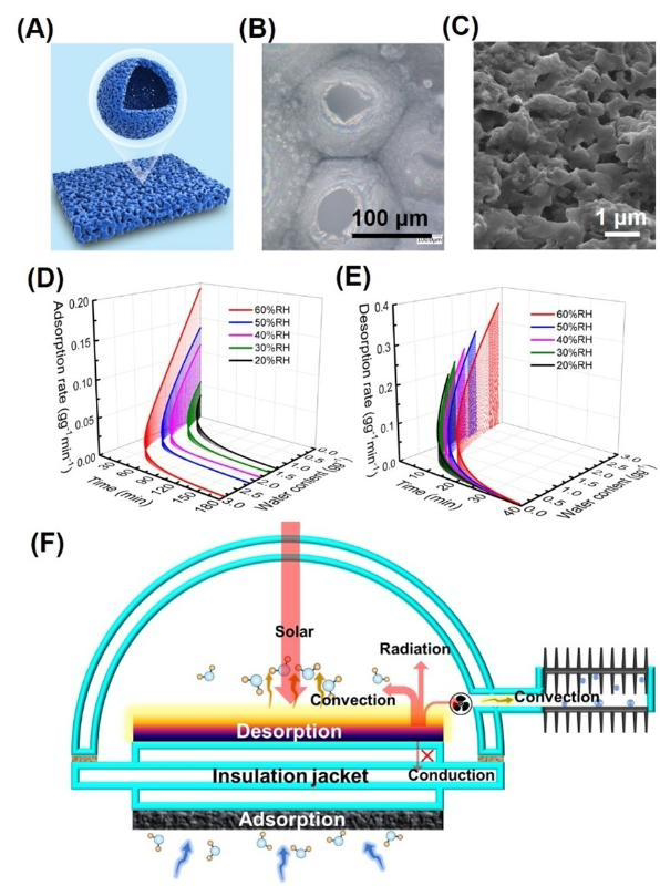 A-C.空心微球多孔吸湿凝胶,D-E.吸附 / 解吸动力学曲线,F 解吸腔 / 冷凝腔串联的空气取水装置