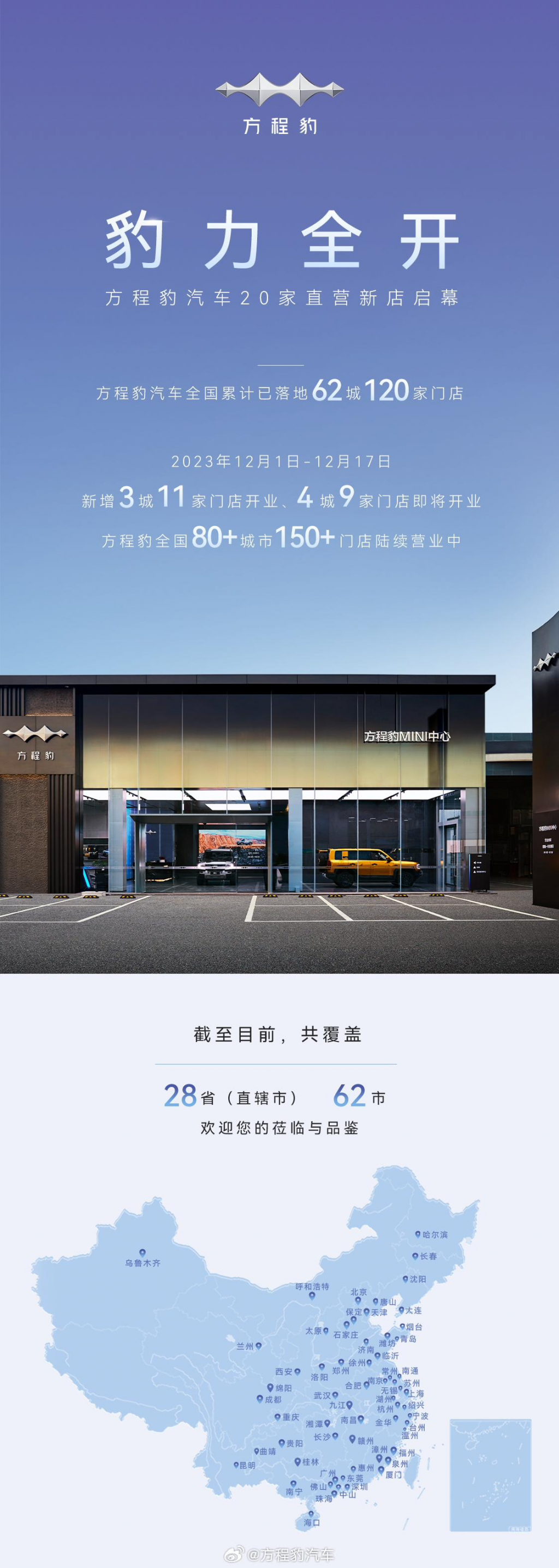 比亚迪方程豹宣布 12 月 1 日-17 日新增 7 城 20 家直营新店,全国累计已落地 62 城 120 家门店。