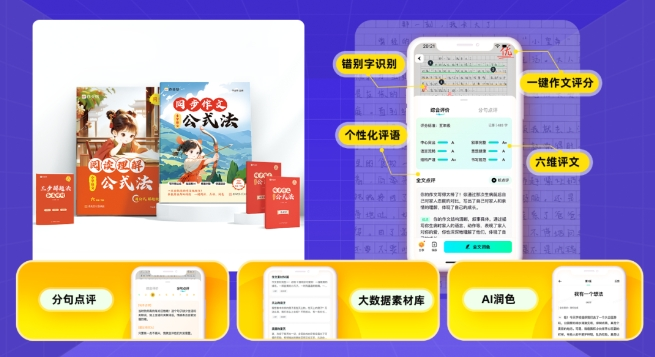 《同步作文公式法》是一本会 AI 批改的作文教辅书。它不仅为每篇作文题目配备了讲解视频,还可以对作文进行智能批改和润色,并提供好词好句作为参考。升级后的版本更加精准,可以实现一键判分、智能点评,帮助学生提升写作水平。