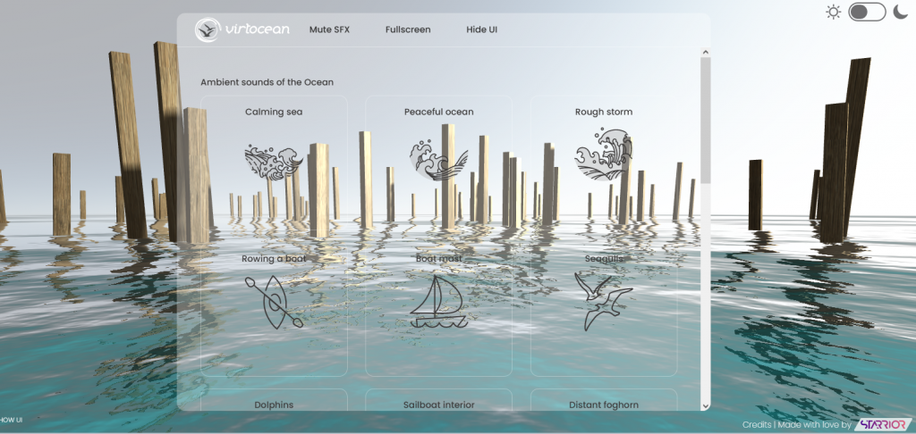 倾听大海 caihua • 虚拟体验 • 2023年12月28日 下午2:02 • 阅读 905 倾听大海的声音 点击进入体验页面 大海的声音 赞 (0) 打赏 微信扫一扫 分享到: 生成海报 0 利信能源获远程商用车“研发贡献奖” 上一篇 2023年12月28日 上午10:17 互助式全球语言学习 下一篇 2023年12月28日 下午2:08 热点文章 虚拟体验 在线放孔明灯 2024年11月4日 618 虚拟体验 白噪音:A Soft Murmur 2023年12月28日 895 虚拟体验 空间站对接模拟 2023年12月27日 927 虚拟体验 探索海底世界 2023年12月29日 953 虚拟体验 全球航班实时动态 2023年12月29日 1.0K 虚拟体验 太阳实时高清图片 2024年11月4日 628 虚拟体验 全球船舶实时航线 2024年11月4日 598 虚拟体验 解压神器指尖陀螺 2023年12月27日 1.1K 虚拟体验 星际穿越模拟器 2023年12月28日 1.1K 虚拟体验 未来世界 2023年12月29日 957 虚拟体验 互助式全球语言学习 2023年12月28日 1.1K