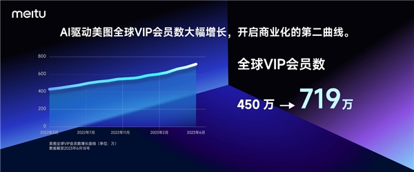 全面提供从生活场景到生产力场景影像服务的同时,美图公布了最新的VIP会员数量,截至2023年6月18日,美图全球VIP会员数为719万。