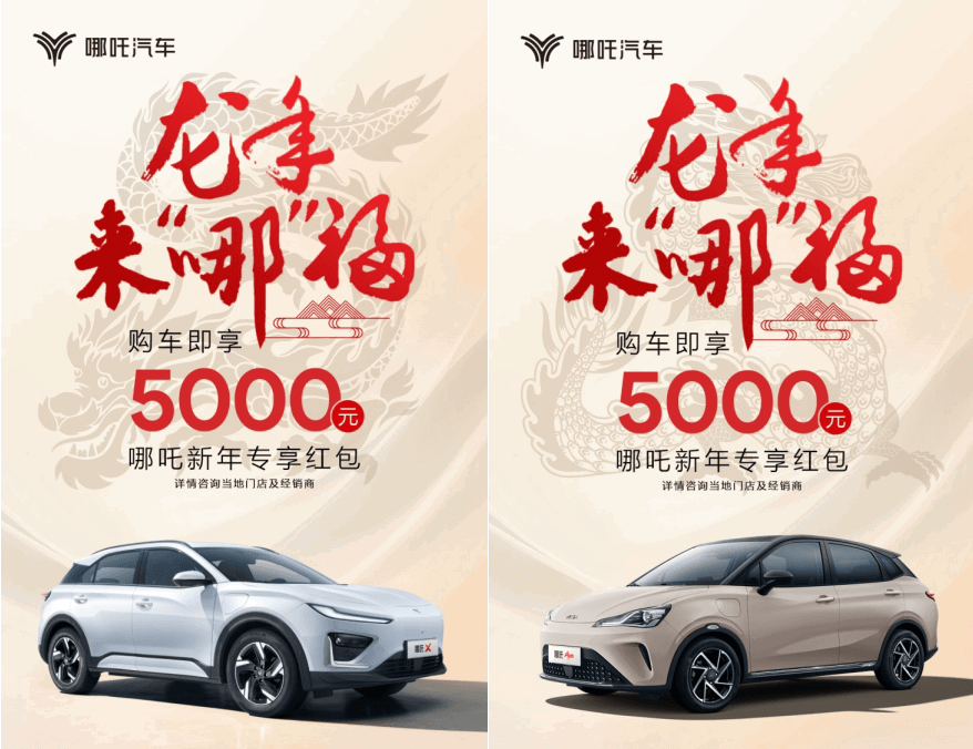 即日起至 1 月 31 日,下定哪吒 X,即可享受 2000 元抵 15000 元限时优惠,下定哪吒 AYA 即可享受 3000 元金融贴息或置换补贴。