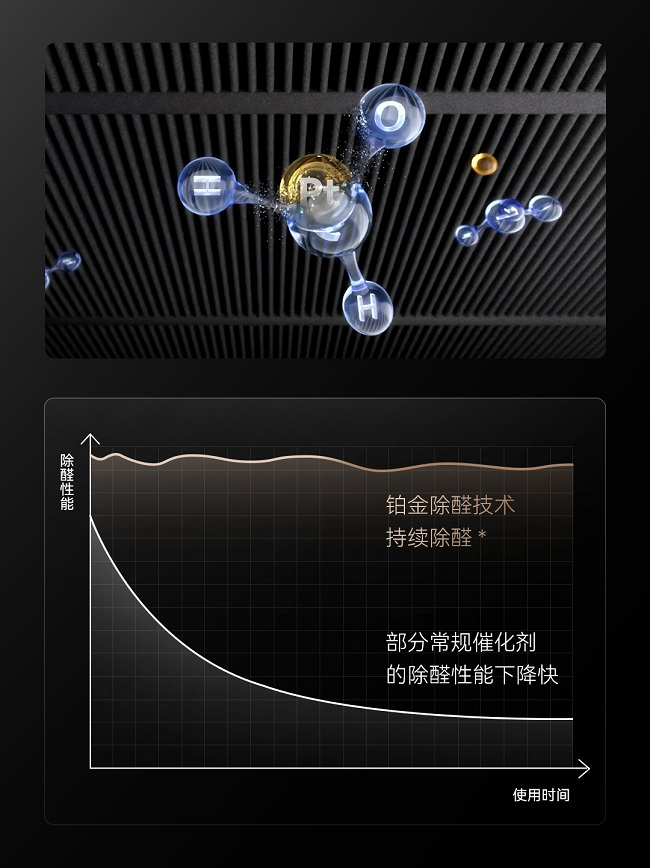 据介绍,依托中科院国家重点实验室, 720 健康科技与中国科学院城市环境研究所(简称:中科院城环所)联合研发出“铂金除醛”技术,搭载此技术的催化醛解滤网在室温下可持续将甲醛彻底分解为水和二氧化碳,无二次污染。铂金单次甲醛去除率高达99.99%*,室内除醛又快、又彻底。铂金除醛技术拥有更稳定、更长久的除醛性能,长效清除家中的甲醛。