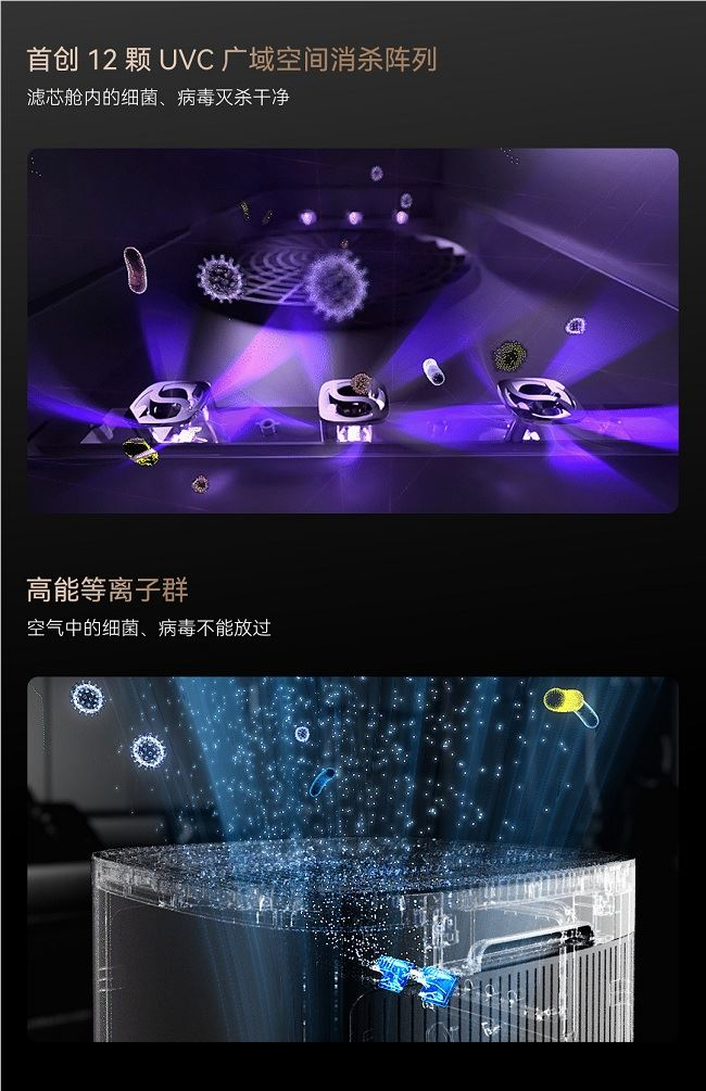 华为智选720 智能空气净化器3Pro通过主动消杀方式,颠覆传统空净产品被动防护,主动长效灭活有害微生物。 720 空净3Pro将首创 12 颗UVC广域空间消杀阵列与高能等离子相结合,可实现消杀舱内和空气中的细菌病毒, 30 分钟灭杀率>99%。