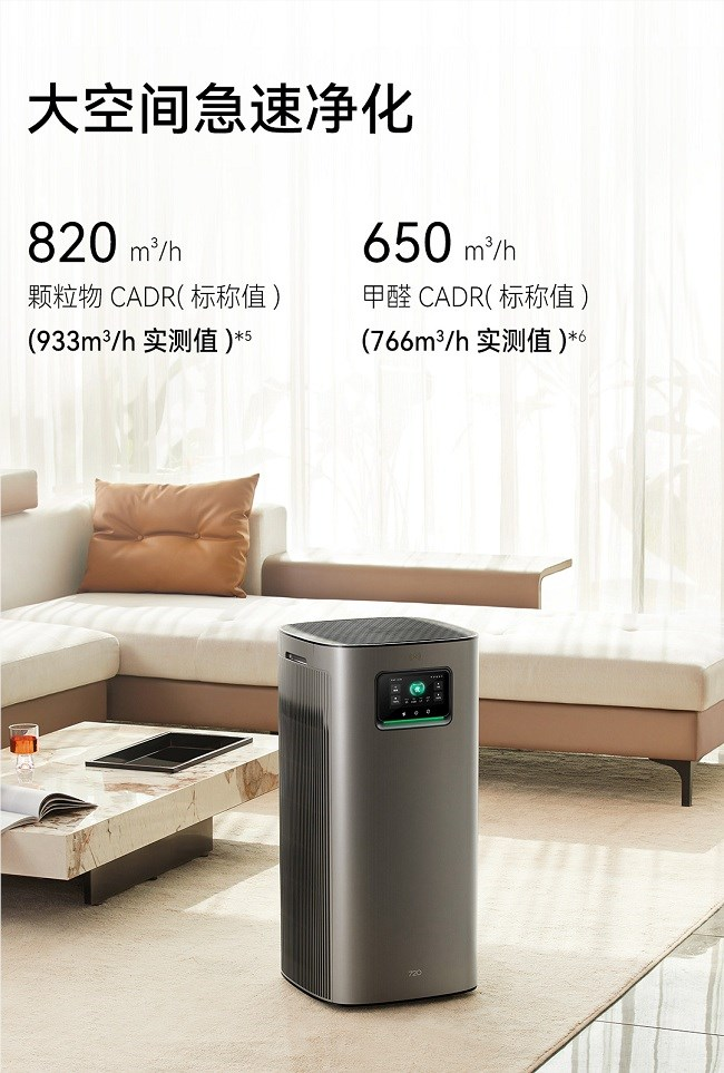 华为智选720 智能空气净化器3Pro拥有强大的净化能力,2. 3 分钟就能净化 15 平米的空气,适用面积达 98 平米,静音性能领先同行的旗舰产品。