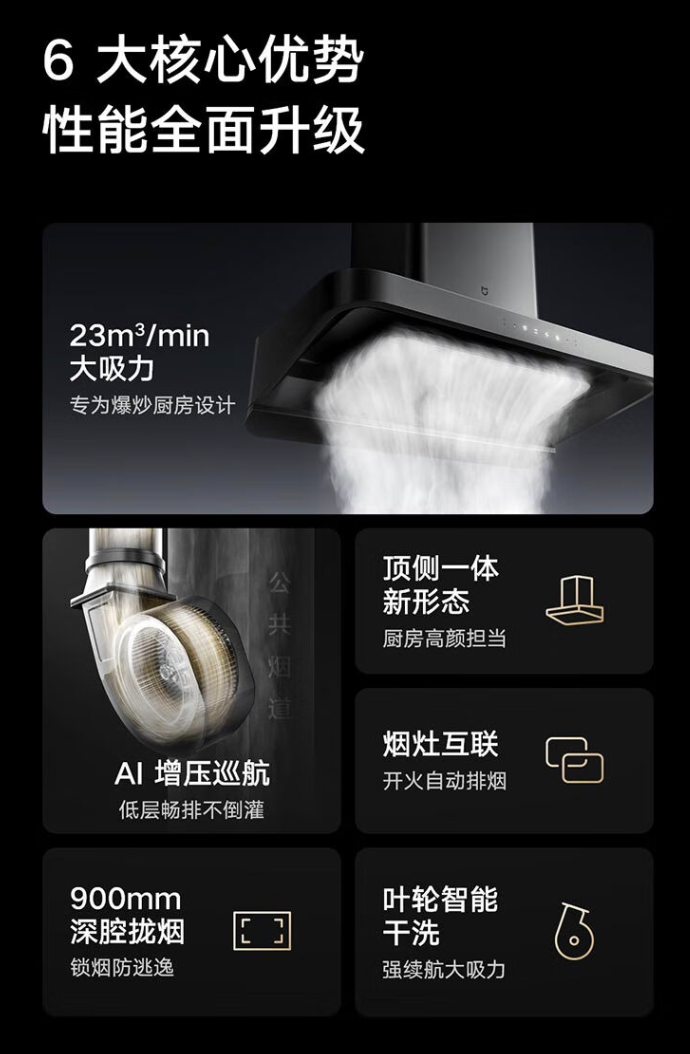 - 通过联动米家 App 或小爱音响,可远程操控净烟机、在线设置清洁提醒、开启智能干洗等功能。