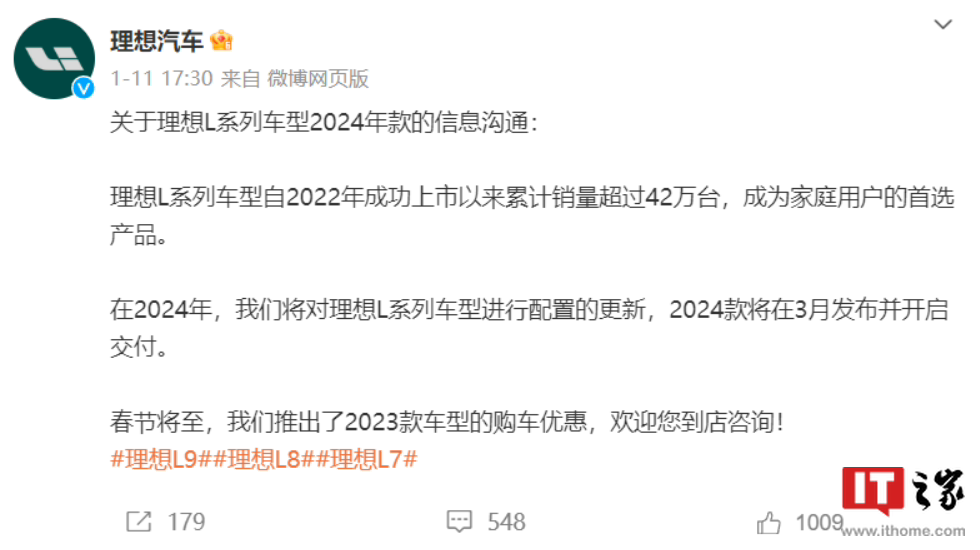对此,理想回应每日经济新闻称:关于 2023 款车型的购车优惠,一方面是为了应对三家豪华品牌(奔驰、宝马、奥迪)持续加剧的价格竞争,另一方面是通过限时新春优惠政策,提前开始产品更新过渡。