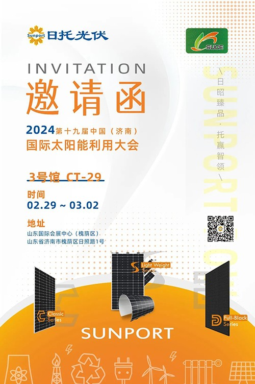 2月29日至3月2日,2024第十九届中国(济南)国际太阳能利用大会将在山东国际会展中心正式举办。一流高端光伏电池及组件供应商日托光伏携诸多精品亮相3号馆CT-29展台,诚邀您前往参观,共商合作。